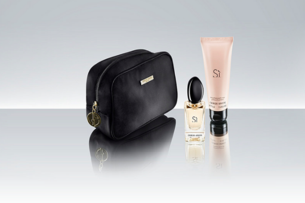 The Giorgio Armani business class amenities kit contains perfume and lotion—men get one set, women get another. Photo courtesy Qatar Airways.