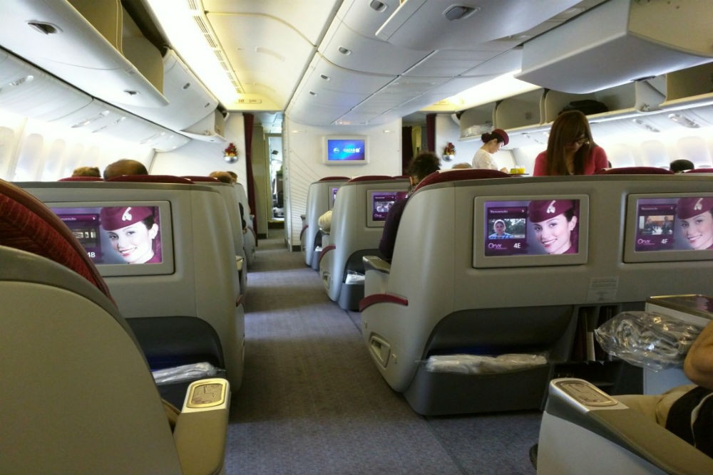 The 777 we took from JFK to Doha had a 2-2-2 configuration. For easiest access to an aisle, choose seats in the middle section. Photo: Billie Cohen.