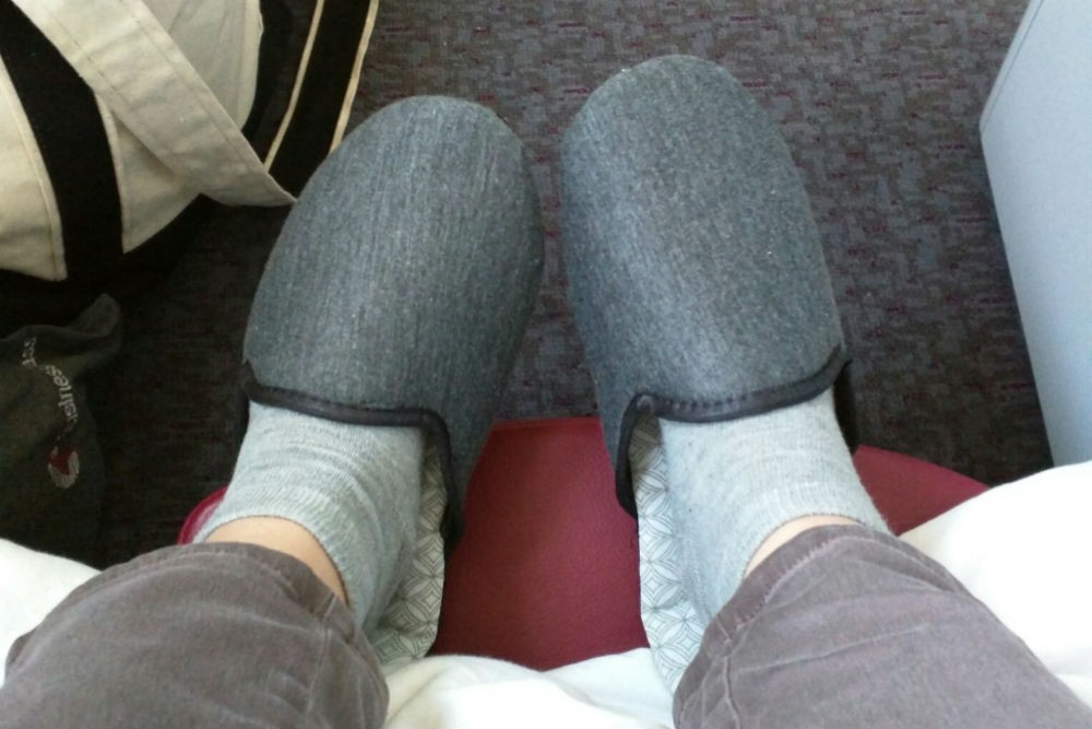 I chose a window seat in on both of my flights. Great for sightseeing (I’m a sucker for takeoff and landing photos), but bad for every time I wanted to go to the bathroom. Once my seatmate was fully reclined and snoring, I was trapped: His feet reached all the way to the wall, so to get out of our row, I had to climb over his legs, a fate I had naively thought was limited to the coach-class experience. Thankfully he was a heavy sleeper and there wasn’t much turbulence. Otherwise, there could have been a very awkward spill onto his bed. If you want to avoid this on your next business class flight, check SeatGuru to determine the cabin’s seat configuration. If it’s 2-2-2, like mine was, choose the middle section to guarantee easy aisle access from both seats.