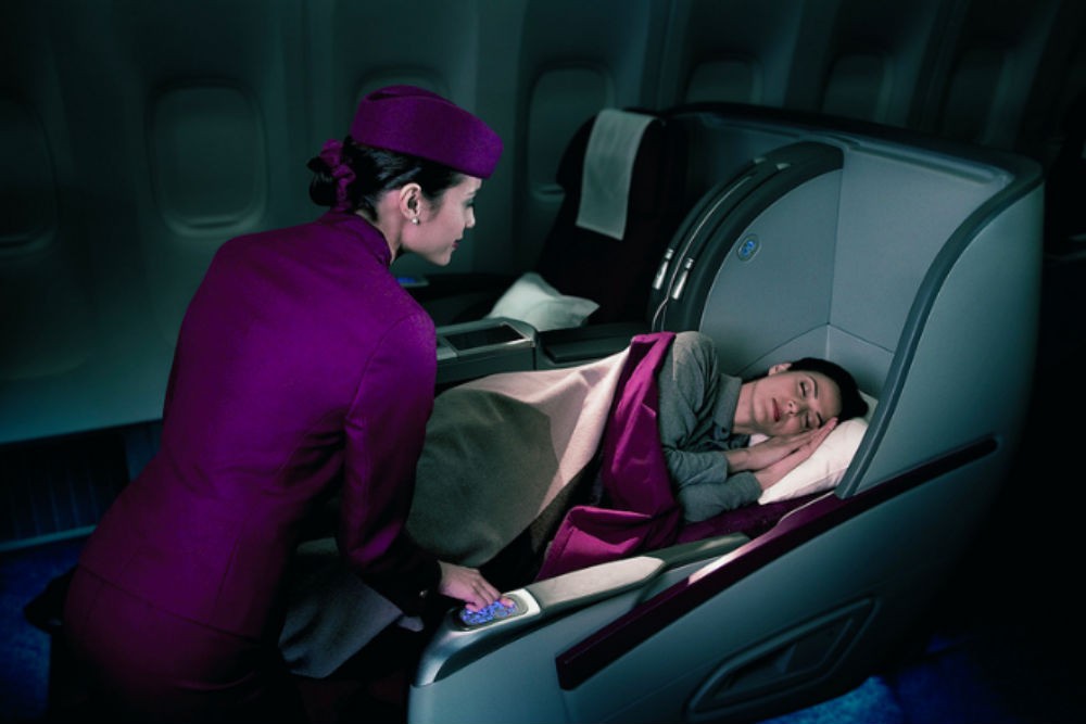 The model in this press photo is not faking—the beds are comfortable. Photo courtesy Qatar Airways.