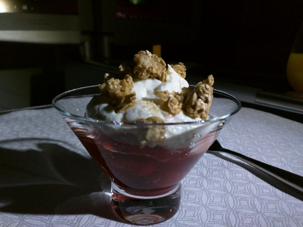 Pumpkin and chestnut soup. Summer greens and mozzarella salad. Greek yogurt with raspberry compote and toasted granola. A selection of desserts from Ladurée. Special dishes created by Nobu Matsuhisa and Vineet Bhatia (the first Indian chef to win a Michelin star). And lots of small details added to the feeling of fine dining: warm mixed nuts, warm bread and butter, mini boxes of Valrhona chocolates, white-cloth napkins, real silverware, and real glasses. Unfortunately, my food pictures are horrible; I have not mastered the art of Instagramming dishes in any appetizing way whatsoever, so I haven’t done justice here, but believe me this was food I would’ve been happy to be served in a restaurant. And the best part is that it’s all delivered to your seat whenever you want, rather than when the flight attendants’ schedule says it’s time.