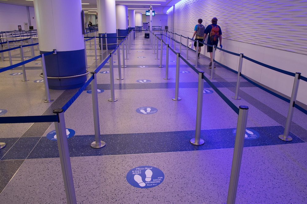 The normally packed security lanes at Newark airport were empty when Tim flew. Note the social-distancing markers on the floor.