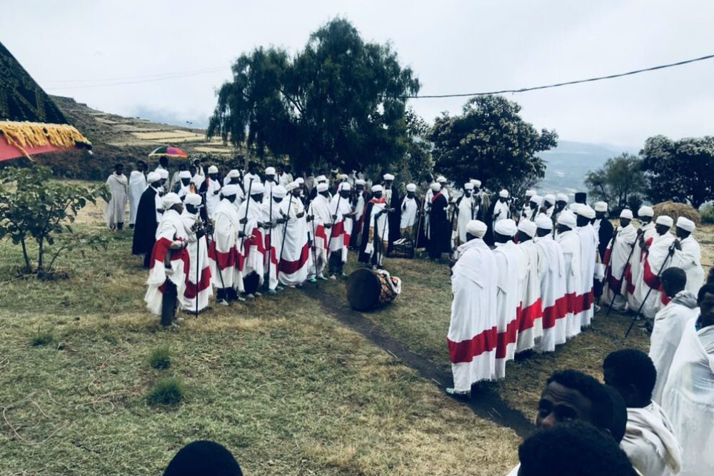 A: Ethiopian churches are really little, and they’re divided into three sections: one that nobody goes into, one that the priests can go into, and a smaller outer section that some people can go into but often not women. So, during church services, most of the people are outside. In Ethiopia it’s not unusual to see groupings of people outside churches or walking for miles—sometimes on a special feast day—dressed in white, walking to the churches.
