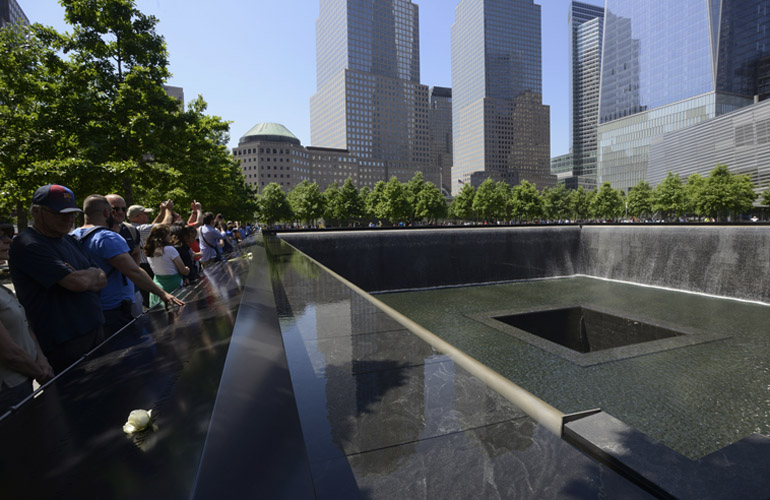 This pool is on the footprint of the World Trade Center’s South Tower. A twin pool is on the footprint of the North Tower. The Memorial Pools are the size of each tower’s footprint. Water cascades over the sides into a black square.
