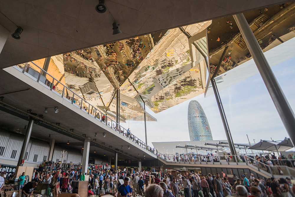 The open-sided Els Encants market has a dramatic roof of mirror-like panels that reflect the mercantile scene below. Frame it with Torre Agbar, a 31-story skyscraper nicknamed the Suppository, rising in the distance.