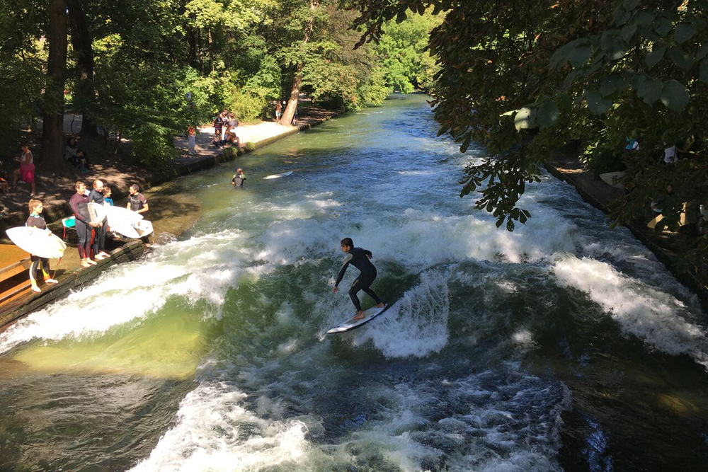 Surfers catch waves in the Eisbach River in Munich’s Englischer Garten. Photo: Claudia Schwenger