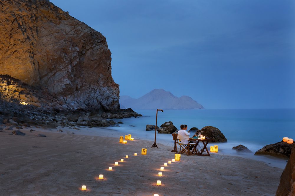 The Beach Restaurant at the Chedi: world-class food and wine, including stunningly fresh seafood, served with a backdrop of the beach and the Gulf of Oman lit up by fire pits.