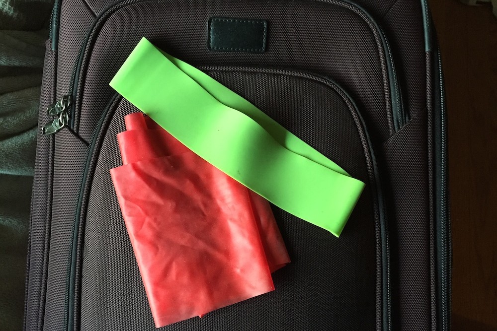 Instead, the bands quickly turn any hotel room into a gym. I use the first band to do arm- and leg-strengthening exercises (here’s a wide array to choose from). And I place the loop band around both legs for bridges, clamshells, and lateral band walks.