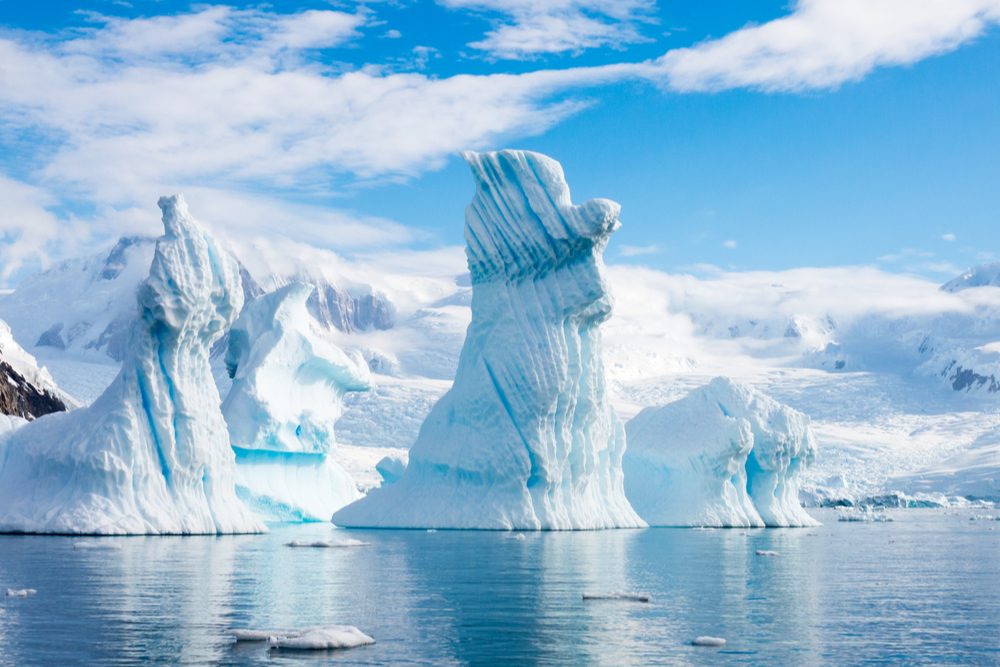 Pinnacle shaped icebergs floating in Andvord Bay near Neko Harbour, Antarctic Peninsula, Antarctica. Photo: Shutterstock