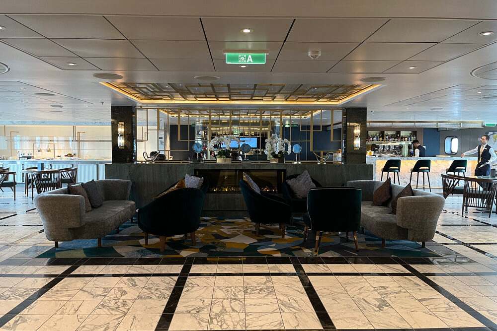 The Arts Cafe on Silver Endeavour, with its crackling faux fireplace, bar that serves everything from hot tea to Champagne, and an array of hot and cold comfort dishes, was our favorite go-to on busy expedition days on Silver Endeavour. Photo: Carolyn Spencer Brown.