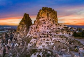 Uchisar Castle—a towering rock formation that was hollowed and used as a fortification in ancient times—in the orange glow of sunrise or sunset, captured from high above the ground in a hot-air balloon.