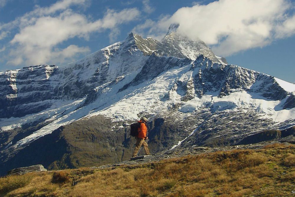 Mount Aspiring New Zealand with snow on mountain and hiker walking in foreground