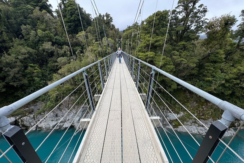 Sandra McLaughlin on the Hokitika Gorge suspension bridge. Photo: Brendan McLaughlin