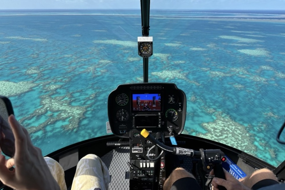 Traveler Debra Redmond and her husband traveled by helicopter to snorkel at the Great Barrier Reef.
