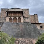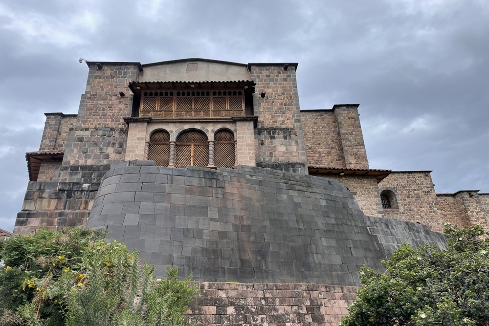 The Coricancha temple in Cusco from the outside on a cloudy day.
