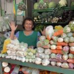 A vendor dressing in colorful clothes at the Lima market in Peru selling variety of vegetables.