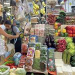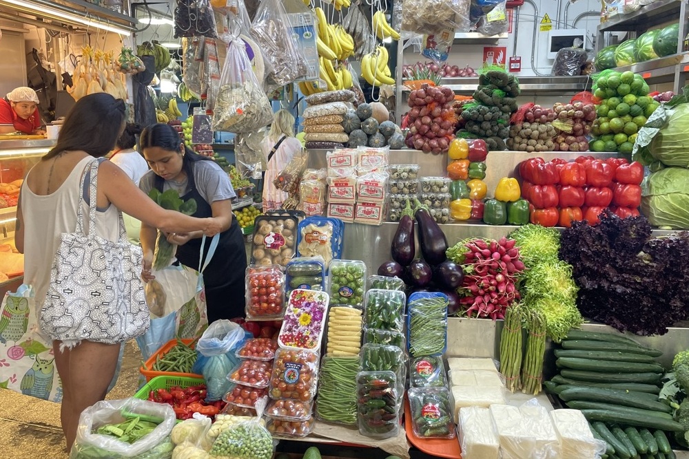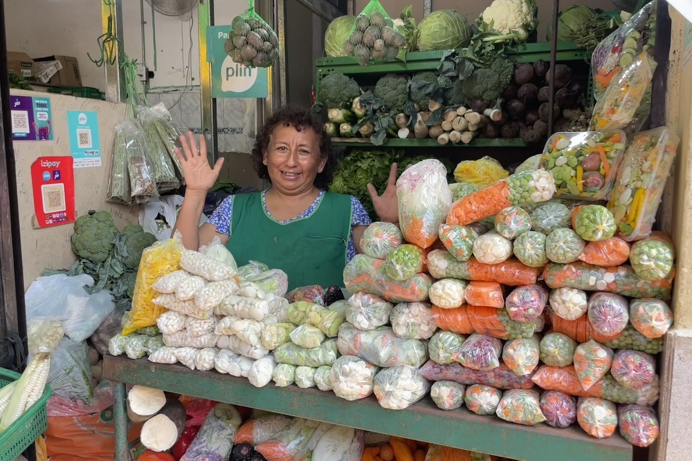 A vendor sells packets of vegetables for soup at a local market in Lima.