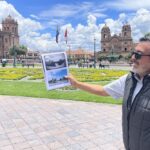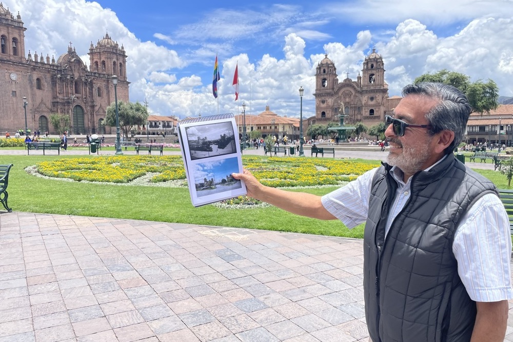 Teo Allain Chambi at Plaza de Armas in Cusco showing photos of from the Plaza.