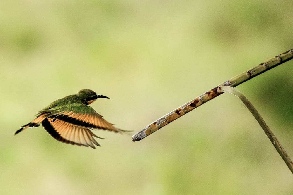 Little bee-eaters are beautiful and quick as lightening. Trying to capture them in mid-air is not an easy feat. Thankfully they will return to an elevated perch again and again while hunting, affording you the opportunity to photograph them as they lift off and land, and not worry about trying to follow them in flight.