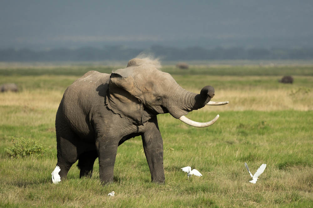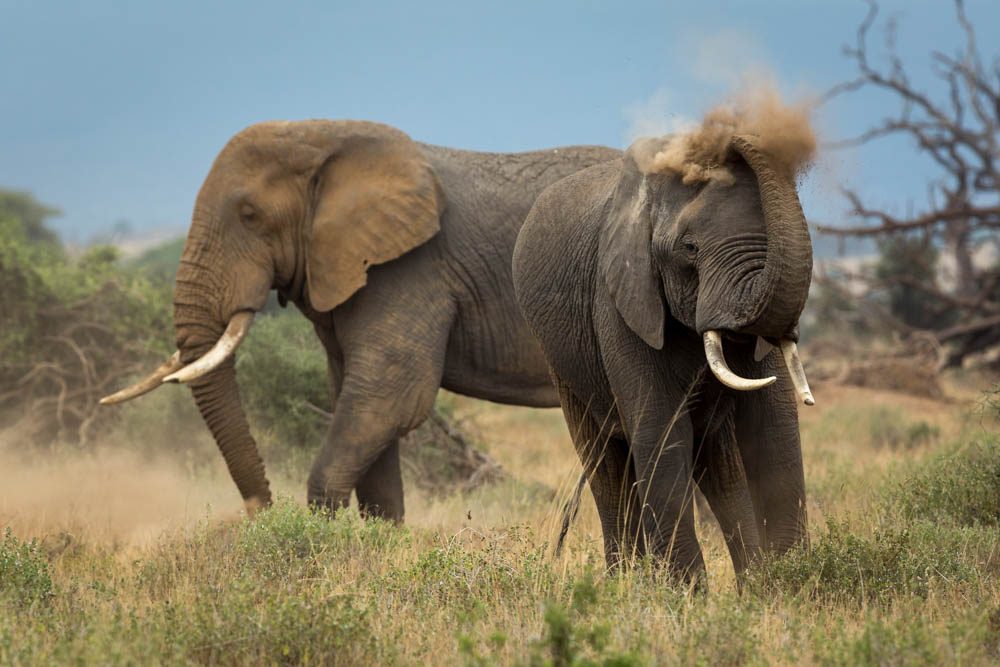 If you come across elephants milling about and kicking at the soil with their toenails, watch carefully, they may throw the loosened dirt on their bodies with their trunks in a behavior called “dusting,” which protects them from the sun and biting insects.