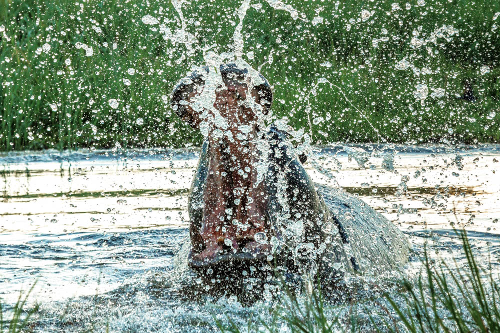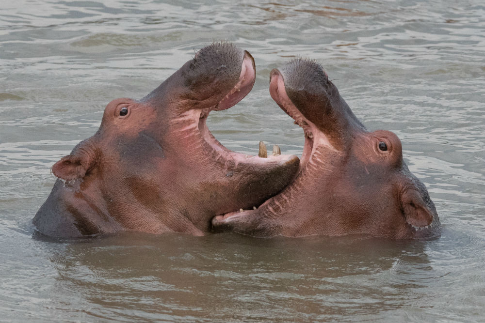 Hippos are grouchy creatures that prefer visitors to keep a distance. Whether it’s another hippo or a different animal entirely, hippos will give unwanted company an impressive open-mouthed warning that exposes their banana-sized teeth. If that doesn’t chase the culprit away, a lot of splashing or a fight may ensue.