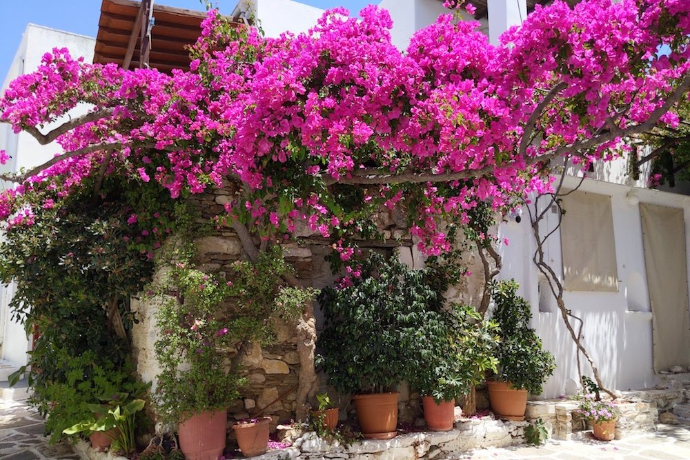 Parikia is the main town, and it’s where you’ll disembark from the ferry, but don’t be put off by the busy, taxi-lined port. Stroll a few streets in, and you’ll be happily lost in a maze of white-washed, stone-paved alleys, where bougainvillea spills around corners and over walls, and restaurants are tucked under trellises overflowing with greenery and lights. (Fun fact: The streets and homes in the Cyclades islands were originally painted white by dictatorial decree in the 1930s—the whitewash is limestone, which is antibacterial and was supposed to combat sickness.)