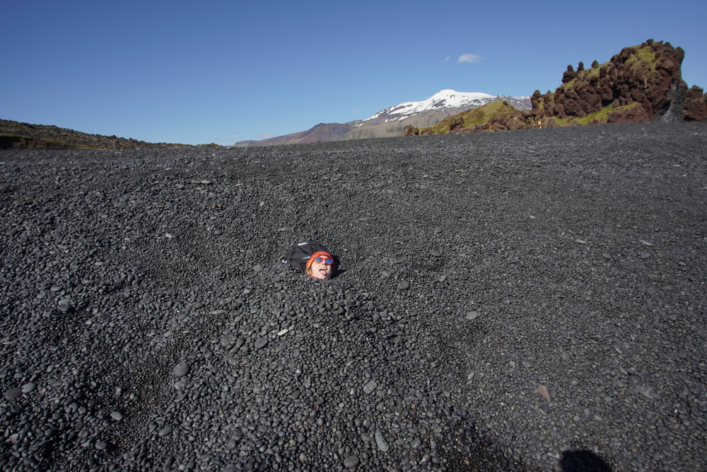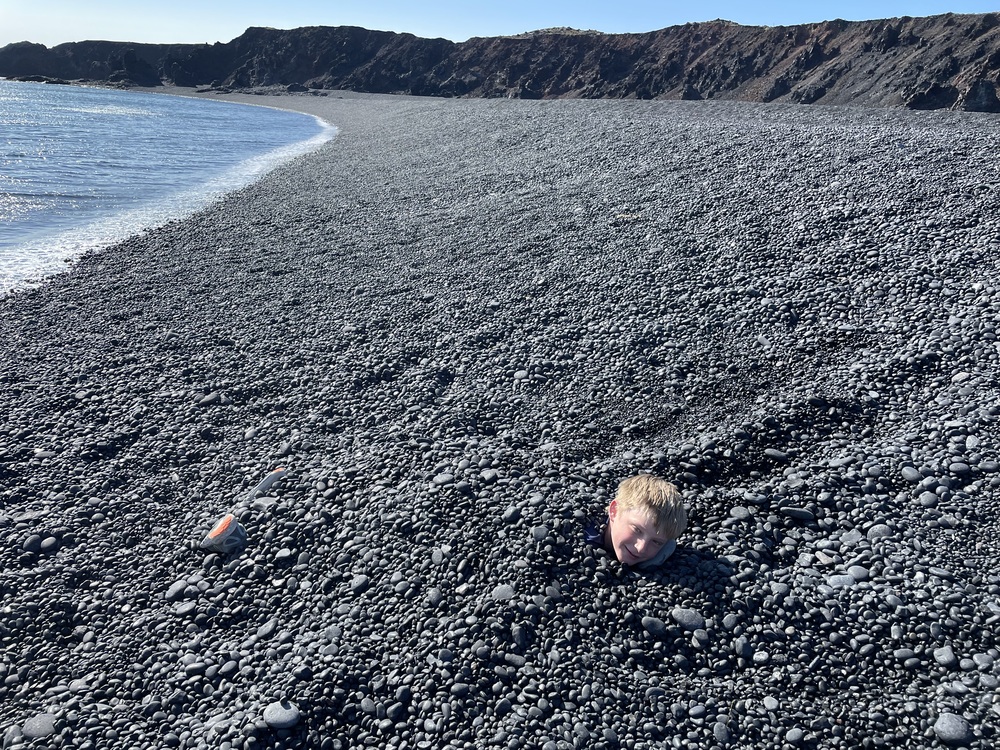 Any trip, however many generations you have on board, needs a good laugh. Another Icelandic black beach delivered. The Djúpalónssandur Beach of shiny ebony pebbles lies on an outcropping of land we referred to as the Snuffleupagus Peninsula (Icelandic is beautiful to listen to but impossible to pronounce; can you say Snæfellsness?). I don’t know whose idea it was to bury Brook in pebbles, but once that had been accomplished and photographed, of course Zeke had to be buried too.