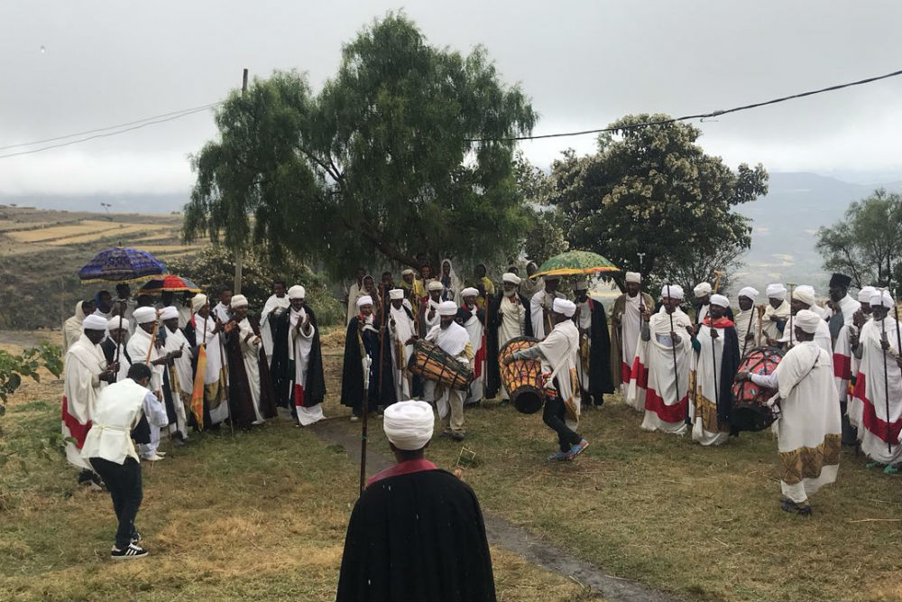 On our second or third morning in Lalibela, our guide Elias led us to a village where some women were outdoors, cooking injera (flatbread) for the priests. Elias had me try our hand at cooking. Then we walked up a little hill and came to a church where there were dozens of priests, as well as musicians—particularly drummers—and a young deacon who greeted us. Then the high priest came and asked our names—because the first thing they do in a procession like this is to pray for someone, and then for the people of Ethiopia, and then for the people of the world. The priests and deacons and musicians sang and danced and proceeded around in a circle with their umbrellas, which are often the ones that they hold over the representative of the ark of the covenant. There were a few other people who came along and kind of joined and watched in the background, but this event was not part of a regular service—it was for us!