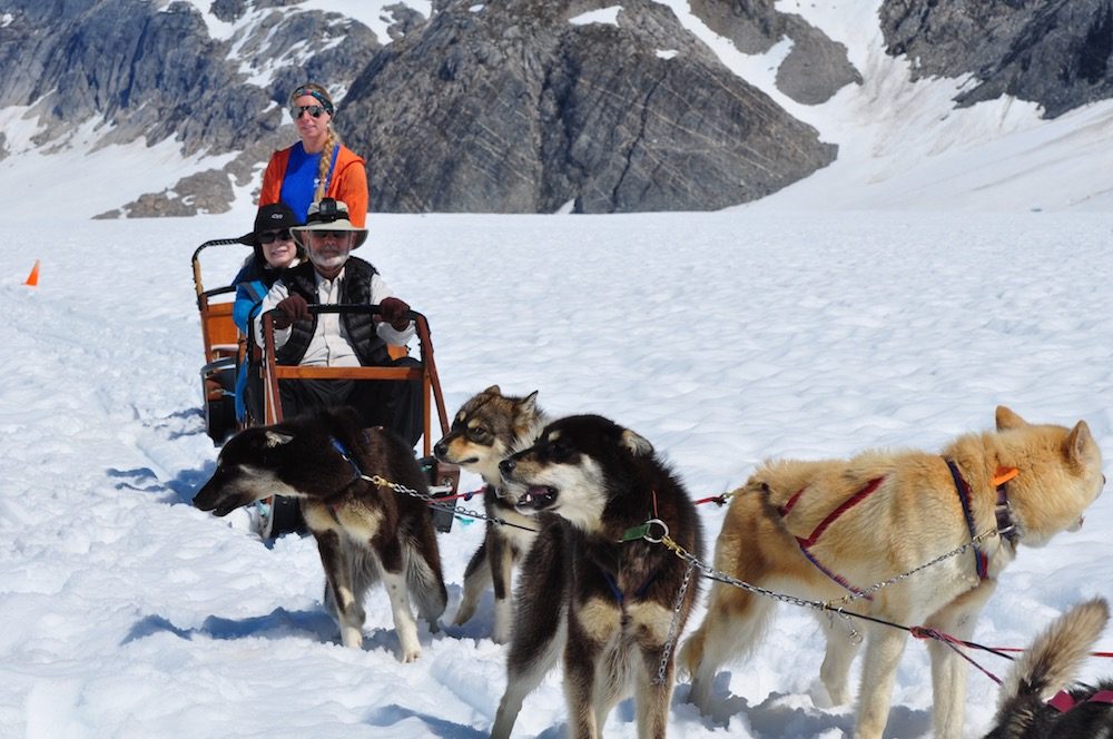 A: When our ship arrived in Juneau, we got on a helicopter, and there were 25 to 30 people going dogsledding as part of a regular Seabourn shore excursion. We were told to get off last, and that’s when we were whisked to the side for our own private experience. A lovely young woman was our guide to the mushers’ camp. Another woman, Grace, was the actual musher. She told us about the history of the dogs and what their life is like, and we got to meet all the dogs. I was petting the dogs while my husband harnessed and booted up the dog team. We loved getting up close and personal with these beautiful creatures. Then we took off on a spin all the way around the perimeter of the glacier.